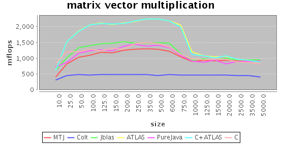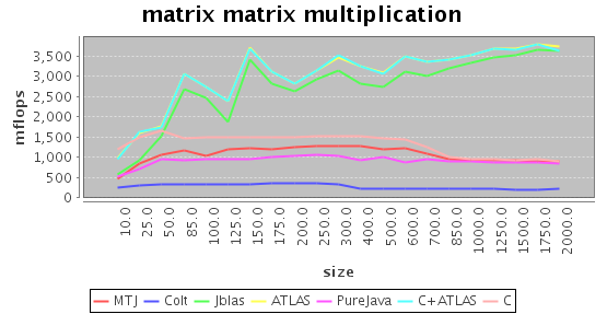 On the buttom line, I'm glad that jblas is pretty fast, certainly faster than Colt and on par with MTJ except for matrix-matrix multiplication. I should add that I used the Java-only versions of Colt and MTJ. It should be possible to optionally link against the ATLAS versions, although Colt does not integrate these methods as well as jblas, and I'm not sure whether MTJ does that.