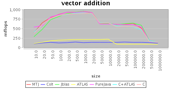 In vector addition the task is simply to add all elements of one vector to all elements of the other vector (in-place). What is interesting about vector addition is that there is really little you can do to optimize the flow of information: You just have to go through the whole vector once. Basically, all methods are on par, with the exception of Colt and ATLAS (!!). No idea what they did wrong, though.