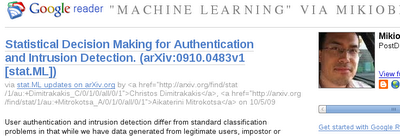 A few days ago, I thought that it would be very nice to have some kind of blog aggregator like planet debian for machine learning. After some poking around I found that the easiest way to aggregate and publish RSS feeds is actually through Google reader. Here is the resulting machine learning feed. Feel free to subscribe to it!