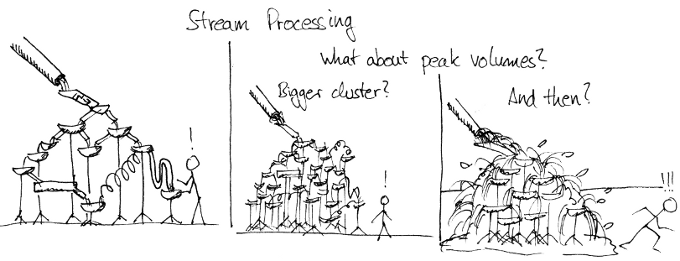 Stream processing, on the other hand, is a nice tool to scale your computations, but it doesn't deal well with peak volumes, and depending on how you persist your data, you run into the same scaling issues as the database centric approach.