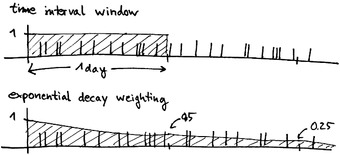 Another approach is to use some form of decay. The idea here is that the "value" of an event decays continually over time until it is eventually zero. That way, you again get an aggregate over some amount of time, although it's not exactly the same thing as a fixed time window. In the end, it doesn't really matter if you understand what it is exactly you're measuring.