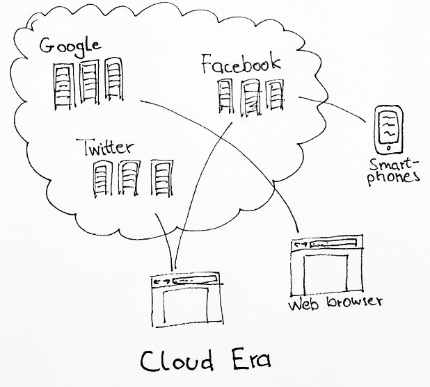 I'm not the first to point out that this is really just the same setup like the mainframe era, only with different technological means. While your computer is in principle able to store enormous amounts of data, and it can provide the same services as the machines in the cloud, it's reduced to a screen to run some web browser.