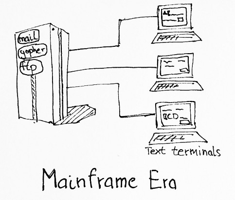 In the mainframe era, computers where huge bulky machines, and only large institutions could afford to have one. People invented time-sharing operating systems to make those computers usable to many people concurrently, which were usually connected through dumb text-terminals. Those terminals mostly worked in a block-oriented manner, meaning that they presented you with a form which you would submit to the server to get the results, a bit like a form on a web page.